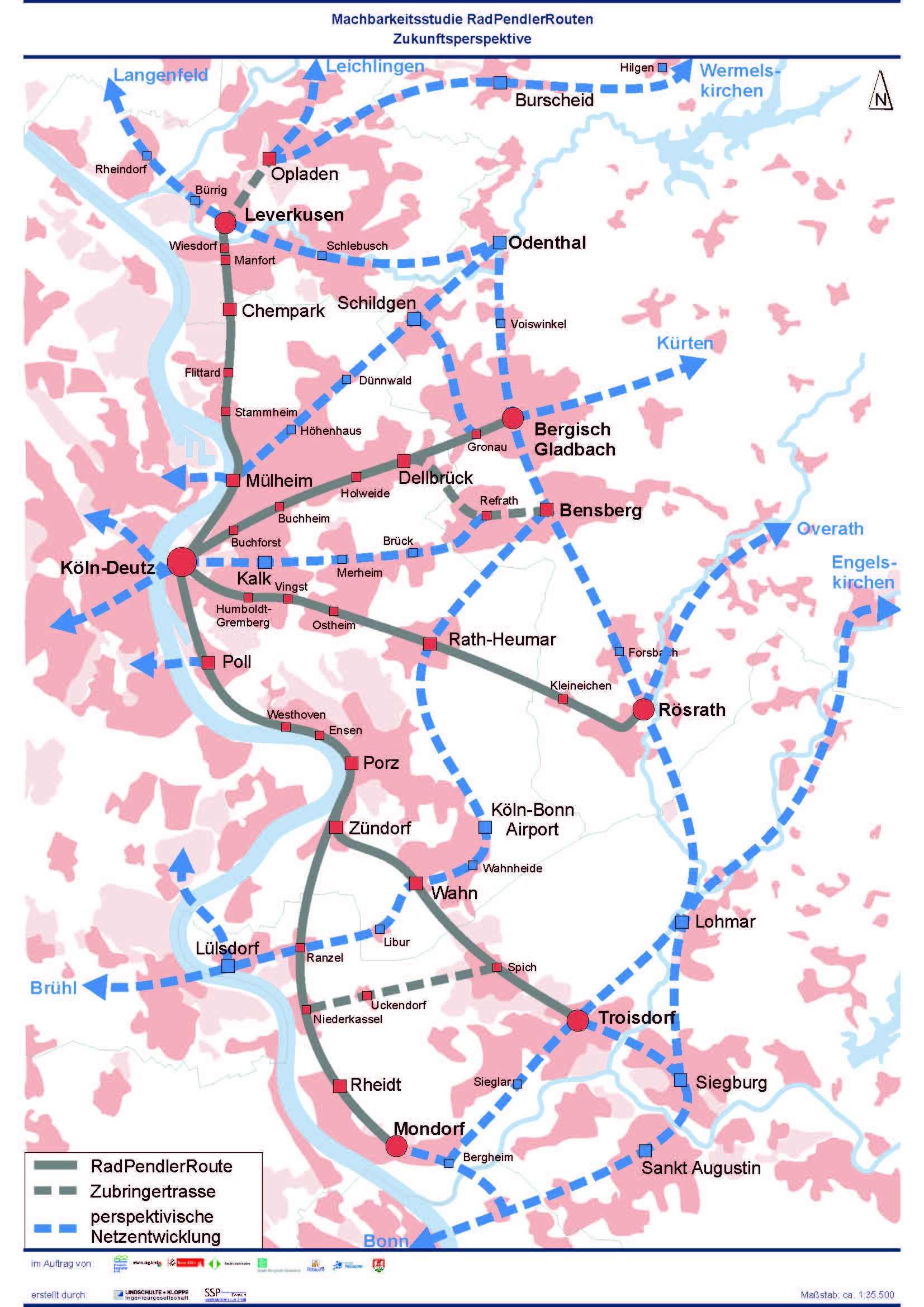 In der 2019 fertiggestellten Machbarkeitsstudie wurden vier Trassen definiert, die aus dem rechtsrheinischen Köln nach Leverkusen, Bergisch Gladbach, Rösrath und Lohmar sowie Troisdorf und Niederkassel mit Anbindung an den öffentlichen Personennahverkehr führen. Die Hauptachsen der "RadPendlerRouten" haben eine Gesamtlänge von rund 80 Kilometern und sollen in Zukunft durch Zubringerrouten ergänzt werden, sodass ein zusammenhängendes Radwegenetz entsteht. Im Rahmen der Machbarkeitsstudie wurde berechnet, dass durch die "RadPendlerRouten" täglich auf den Trassen Leverkusen/Köln rund 1.500, Bergisch Gladbach/ Köln rund 2.200, Rösrath/Köln rund 2.300, Troisdorf/Köln 4.500 sowie Niederkassel/Köln 3.800 Fahrradfahrerinnen und -fahrer mehr unterwegs sein könnten, als dies bisher der Fall ist.