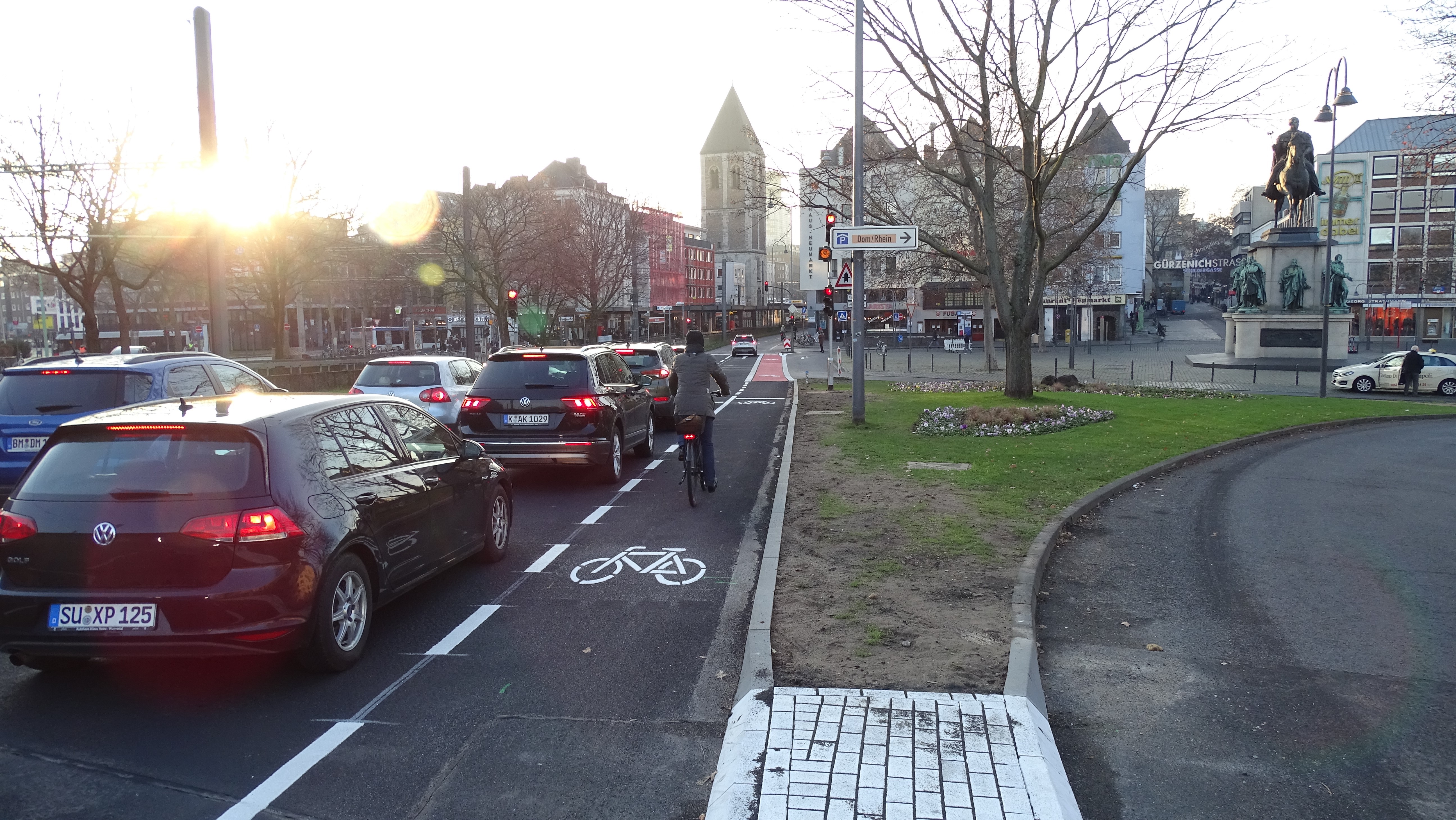 • Verlagerung des Radverkehrs auf der Aachener Straße zwischen Brabanter- und Moltkestraße vom schmalen, konfliktträchtigen Radweg auf einen Radfahrstreifen,