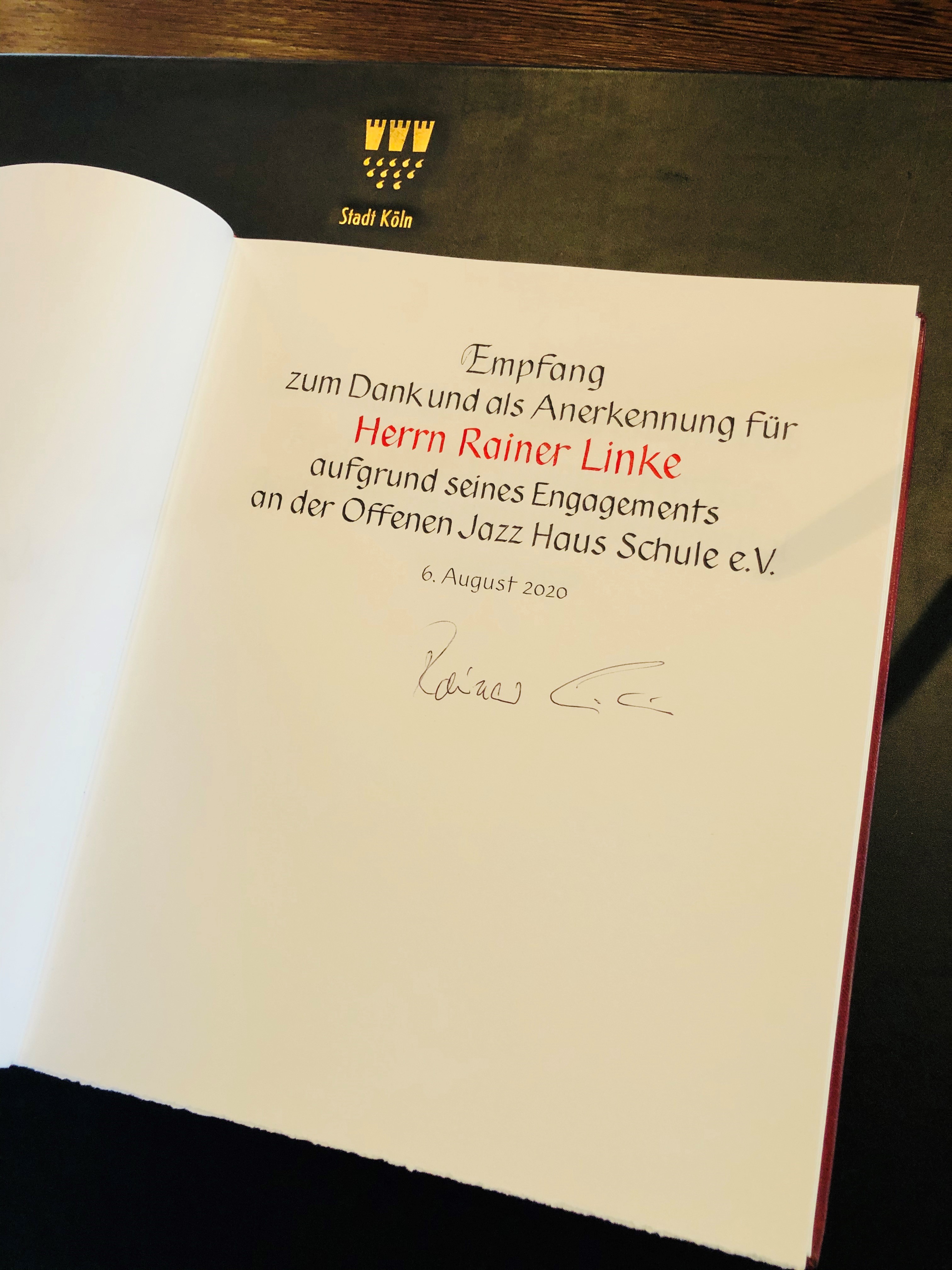 1980 hat Rainer Linke in Köln die "Offene Jazzhaus-Schule" gegründet und sie bis 2020 geleitet. 40 Jahre Engagement in der Vermittlung von Musik und im Zusammenbringen von Menschen vieler Nationalitäten und Kulturkreise. Dieses Engagement hat Oberbürgermeisterin Henriette Reker mit einem Empfang im Hansasaal des Historischen Rathauses gewürdigt. Hierbei hat sich Linke ins Gästebuch der Stadt Köln eingetragen.