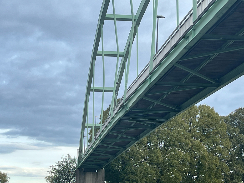 Bei der Einfahrt in den Hafen hat ein Schiff mit aufgestelltem Kran den Brückenüberbau erheblich beschädigt. Wesentliche Teile der Tragkonstruktion, beispielsweise Hauptträger, Querträger und Hänger, unterliegen erheblichen Verformungen. Aus diesem Grund muss der Fuß- und Radweg gesperrt werden. Die Umleitungsbeschilderung ist veranlasst und wird ab Donnerstag aufgebaut.