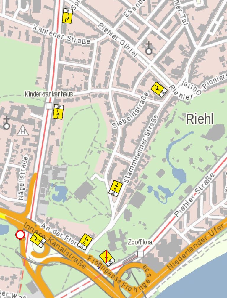 Die Stadt Köln lässt zwischen Donnerstag, 23. Januar 2020, und je nach Witterung voraussichtlich Freitag, 7. Februar 2020, im Vorgriff auf eine Sanierungsmaßnahme vorbereitende Arbeiten auf der Abfahrt von der Inneren Kanalstraße (Fahrtrichtung Zoobrücke) zur Riehler Straße in Köln-Riehl hin durchführen. Es handelt sich um die erste Abfahrt gleich hinter dem Lentpark.