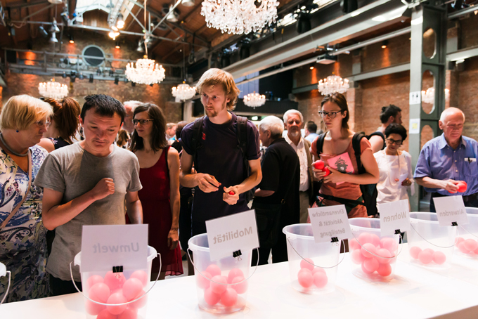 Eine erste Bestandsaufnahme wurde noch am gleichen Abend durch die Oberbürgermeisterin vorgenommen. Bei "3 Bälle für meinen Bezirk", bei dem rote Bälle in Eimer geworfen werden konnten, zeigte jeder Eimer ein Entwicklungsfeld, das gewichtet werden konnte. In den Eimer "Wohnen" wurden die meisten Bälle geworfen.