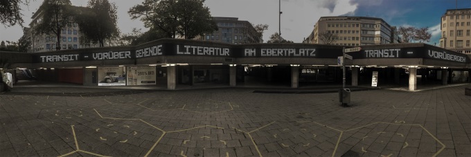 Ab Freitag, 9. April 2021 (ab etwa 17 Uhr) zeigt "Unser Ebertplatz" erneut, wie sich Stadtraum durch künstlerische Kreativität beleben lässt. Aufgrund der Corona-Pandemie können seit Monaten keine klassischen Kulturformate und Literaturformate in Innenräumen stattfinden. Das Projekt "TRANSIT – Vorübergehende Literatur am Ebertplatz" schafft nun mit Beginn der wärmeren Jahreszeit einen neuartigen Zugang zur Gegenwartsliteratur. Ab Freitagabend rollen kurze literarische Texte auf einem großen LED-Laufband über den Platz. Das LED-Laufband ist auf den Waschbeton-Fries oberhalb der Kunstraumpassage montiert und verwandelt den  Ebertplatz mit seinen zahlreichen Sitzmöglichkeiten und Teilflächen zum großflächigen Open Air-Resonanzraum.