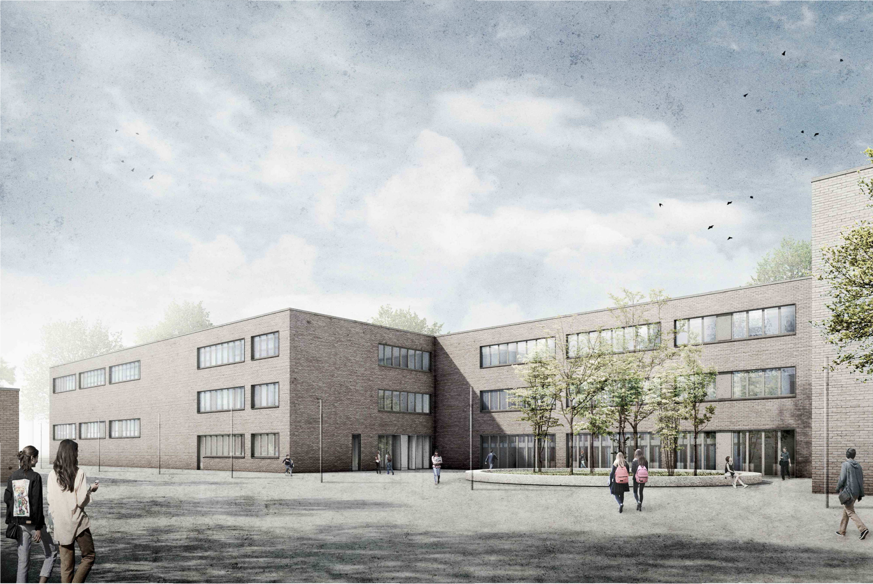 Der architektonische Entwurf für den Neubau stammt aus dem Büro Kastner Pichler Architekten. Die Erschließung des Neubaus orientiert sich am Bestandsgebäude. Er kann sowohl direkt von der Sürther Straße als auch über das große Foyer des Hauptgebäudes, unter dem Brückenbauwerk der Bibliothek hindurch, erreicht werden. Die neue Einfachturnhalle orientiert sich in der Lage an denen der Bestandsturnhallen und wird für externe Nutzer so zugänglich gemacht, dass sie dazu das Schulgrundstück nicht betreten müssen.