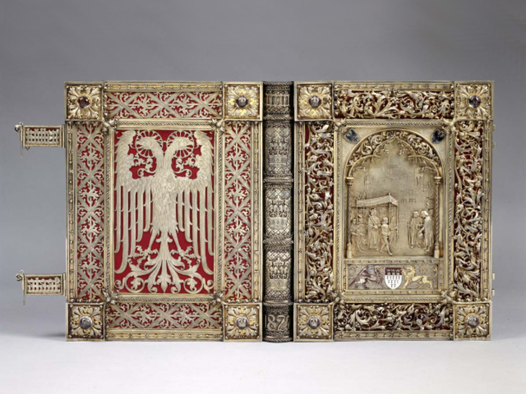1897 fertigte der Kölner Hof-Goldschmied Gabriel Hermeling im Auftrag der Stadt Köln das Goldene Buch an. Die Gestaltung nimmt Bezug auf die führende Rolle Kölns im Spätmittelalter. Das vergoldete Silberrelief auf der Vorderseite zeigt Kaiser Maximilian I. auf dem Reichstag zu Köln 1505. Der Kaiser unter dem Baldachin wird von den beiden Bürgermeistern empfangen, im Hintergrund erkennt man den Gürzenich und dahinter den Ratsturm. Unterhalb des Reliefs ist das Kölner Dreikronen-Wappen in Emaille zu sehen, flankiert von Löwe und Greif. Kostbares Rankenwerk rahmt die Szene. Hierfür hat Hermeling ein Vorbild: das gotische Richtschwert der Kölner Erzbischöfe aus dem 15. Jahrhundert.