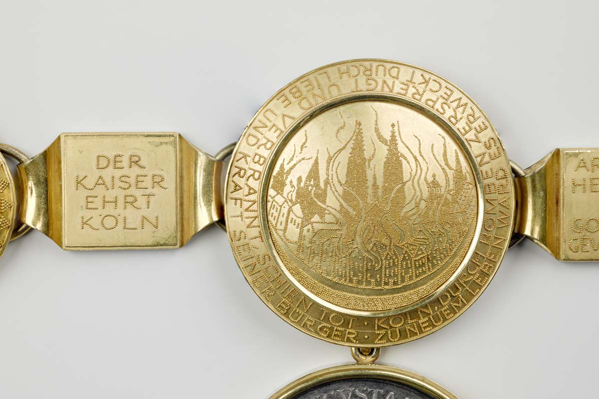 Das Prunkstück ist der Vorderschild. Wo sich auf der alten Amtskette nur ein Bildnis des preußischen Königs befand, sieht man nun die figürlich gestaltete Anbetung der Heiligen Drei Könige, in Anlehnung an den gotischen Bischofsstab des Kölner Erzbischofs. Darunter hängen ein Ursulataler sowie Münzbildnisse von Augustus, Agrippina der Älteren und Claudius. Antike und frühneuzeitliche Münzen in den Kettengliedern stehen für die Geschichte der Stadt von den Anfängen bis zur Zerstörung 1945 – auf der zentralen Medaille des Rückengehänges ist zu lesen: "Köln, durch Bomben zersprengt und verbrannt, schien tot / zu neuem Leben ward es erweckt durch Liebe und Kraft seiner Bürger".
