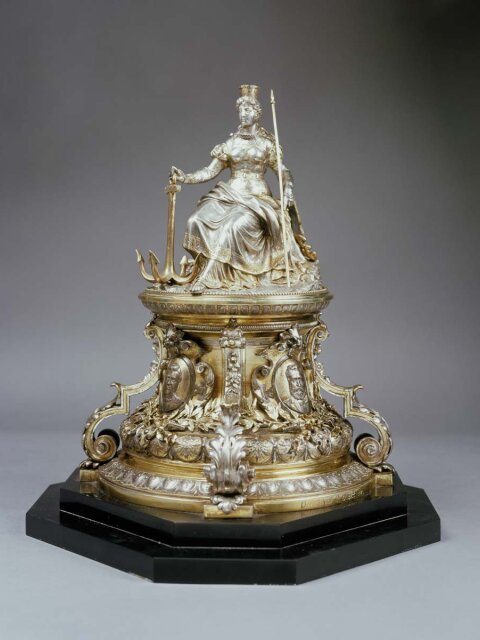 Die Colonia mit Mauerkrone hält einen Anker als Zeichen der Hoffnung, in der anderen Hand eine Lanze und einen Schild mit dem Wappen der Stadt Köln mit Merkurstab. Stab und Anker führt sie als Signet der Versicherung, die sich dem weltweiten Handel widmete. Colonia thront auf einem Sockel im neo-barocken Stil, denn man wählte nicht die Stilvorgabe "spätgotisch", die für das Ratssilber verbindlich war. Zwischen den Voluten erkennt man Bildnismedaillons. Sie zeigen wohl jene "Hauptagenten" der Versicherung, die das Geschenk für ihren Chef gestiftet hatten.