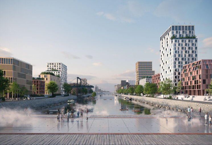 Mit hohem Anspruch an Lebensqualität und Nachhaltigkeit entstehen hier vielfältige Wohn- und Arbeitswelten für circa 6.900 Bewohner*innen und rund 6.000 Arbeitsplätze sowie alles, was zu einem lebenswerten Quartier dazugehört: Kitas, eine Grundschule, Gastronomie, Kultur- und Freizeitangebote, Parks, mehrere Stadtplätze, eine Promenade entlang des Hafenbeckens sowie Zugänge zum Wasser. Zwei neue Brücken über das Hafenbecken und ein ausgewogenes Verkehrskonzept ermöglichen fußgänger- und radfahrerfreundliche Mobilität. Die denkmalgeschützten Mühlengebäude werden umgebaut und bleiben dem Quartier als identitätsstiftende architektonische Wahrzeichen erhalten.