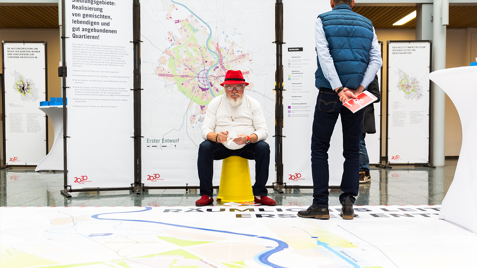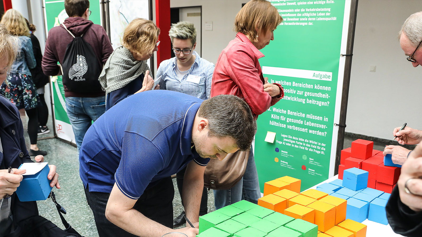 Methode: Verschiedene Mitmachstationen luden zu einer vertiefenden Auseinandersetzung mit dem ersten Entwurf der "Stadträumlichen Perspektive" ein. An zahlreichen Stelllwänden konnten die Teilnehmenden Karten, Pläne und erläuternde Texte einsehen und diskutieren. Im Fokus standen zwölf räumliche Ansätze, die mittels Piktogrammen zentrale Entwicklungsziele Kölns visualisierten. Über Kommentarkarten konnten die Teilnehmenden Rückmeldungen zu den Ansätzen geben und eigene Ideen einbringen.
