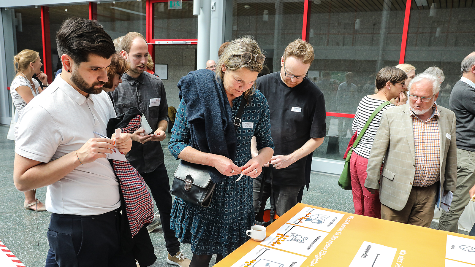 Methode: An fünf Themeninseln konnten die Teilnehmenden das vorgestellte Zielgerüst der Stadtstrategie kommentieren. Dabei standen große Planen mit den fünf Leitsätzen und den zugeordneten Zielen zur Diskussion, auf denen mit Post-Its und Punktaufklebern individuelle Rückmeldungen, Anregungen und Ideen gesammelt wurden. Ergänzt haben wir die Diskussionen durch Mitmachangebote, zum Beispiel durch Umfragen zum Mobilitätsverhalten oder zur gemeinschaftlichen Nutzung von Angeboten im Veedel.