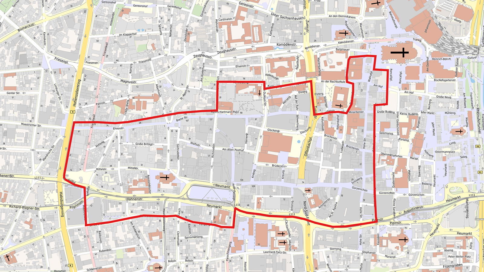 Die Karte zeigt die Kölner Innenstadt, ein rot umrandetet Bereich stellt den Aktionsraum des Zentrenmanagements für die Kölner City dar.© Stadt Köln