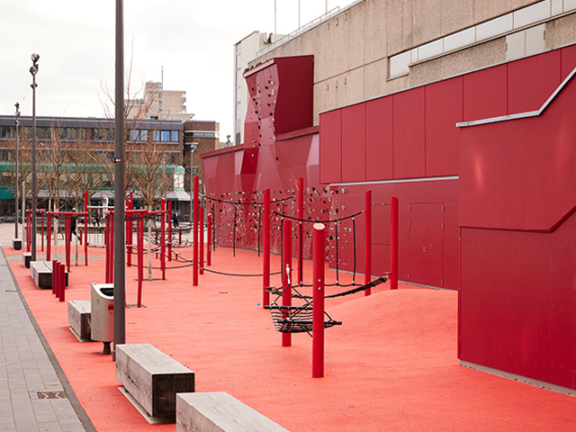 An der Nordfassade des CityCenters entstand ein Kletterbereich mit Boulderwand und Spielgeräten. Hier sind jetzt auch eine kleine Holzbühne für Veranstaltungen sowie mehrere Sitzbänke. Gegenüber ist eine großzügige Sitzstufen- und Treppenanlage mit zusätzlichen Bäumen entstanden.