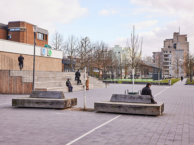 Der "Tisch der Nationen" zwischen den Baumreihen an der Ostseite des Platzes wurde als Kunstaktion mit Keramikfliesen gestaltet. Er kann jetzt für Veranstaltungen genutzt werden, mehrere Bänke bieten Sitzmöglichkeiten an. Die vorhandene Mauer am Kirchenvorplatz wurde entfernt und durch eine Sitzstufenanlage ersetzt. Der Cronenbourg-Brunnen wurde an seinen neuen Standort gegenüber dem Eingang zum Bezirksrathaus versetzt und durch eine niedrige Mauer gefasst. Südlich des Eingangsgebäudes zur S-Bahn wurde eine Holztribüne errichtet.