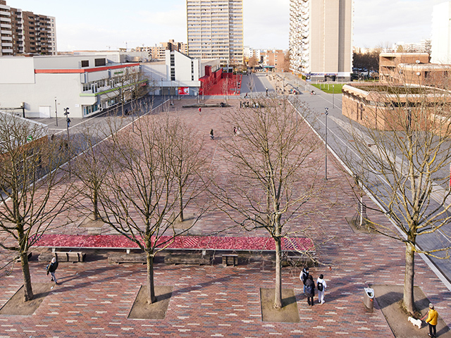 Der Pariser Platz als zentraler Stadtplatz in Chorweiler erhielt ein attraktives Wasserspiel. Sechzehn Bodendüsen sorgen für bis zu fünf Meter hohe Wasserfontänen. Die Platzfläche wurde mit einem changierenden Belag aus Pflasterklinkern neu befestigt.