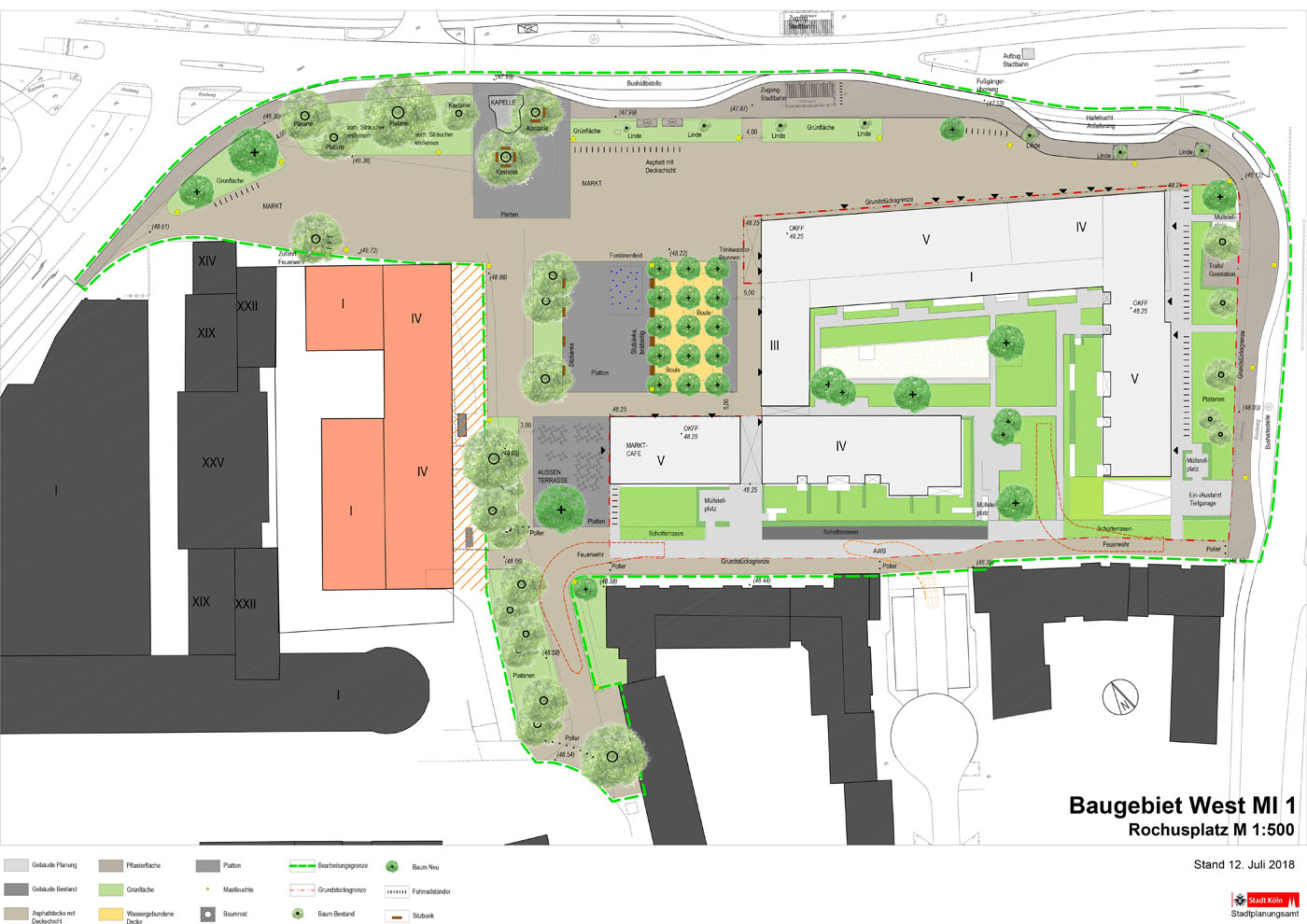 Da keine Planung für das neue Baufeld vorliegt, berücksichtigen wir für die Umgestaltung des Rochusplatzes die aktuell bestehende Situation.