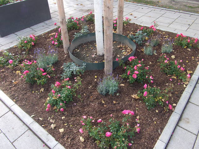 Nach der Umgestaltung des Marienberger Hofes wurden im Dezember 2019 die neuen Pflanzkübel als Ersatz für das Hochbeet in einer ersten Gemeinschaftsaktion mit engagierten Bewohner*innen mit drei Kupfer-Felsenbirnen, die im Sommer wohlschmeckende Früchte tragen und mit Beetrosen bepflanzt. In einer zweiten Pflanzaktion im Oktober 2020 wurden die Baumbeetscheiben unter fachkundiger Begleitung des ehemaligen Leiters des Rheinparks Gerhard Böckmann, der ehrenamtlich die Baumpaten betreut, gemeinsam mit allen, die eine Baumbeetpatenschaft übernommen haben, nach ihren eigenen Wünschen bepflanzt. Etwa 170 Pflanzen (Rosen, Lavendel, Salbei et cetera) lassen die Baumbeete in neuem Glanz erstrahlen.