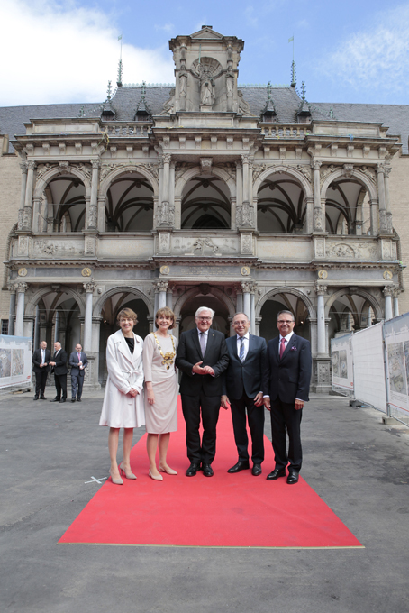 Von links: Elke Büdenbender (Ehefrau von Bundespräsident Dr. Frank-Walter Steinmeier), Oberbürgermeisterin Henriette Reker, Bundespräsident Dr. Frank-Walter Steinmeier, NRW-Finanzminister Dr. Norbert Walter-Borjans und Perry Somers (Ehemann von Oberbürgermeisterin Henriette Reker) vor dem Historischen Rathaus