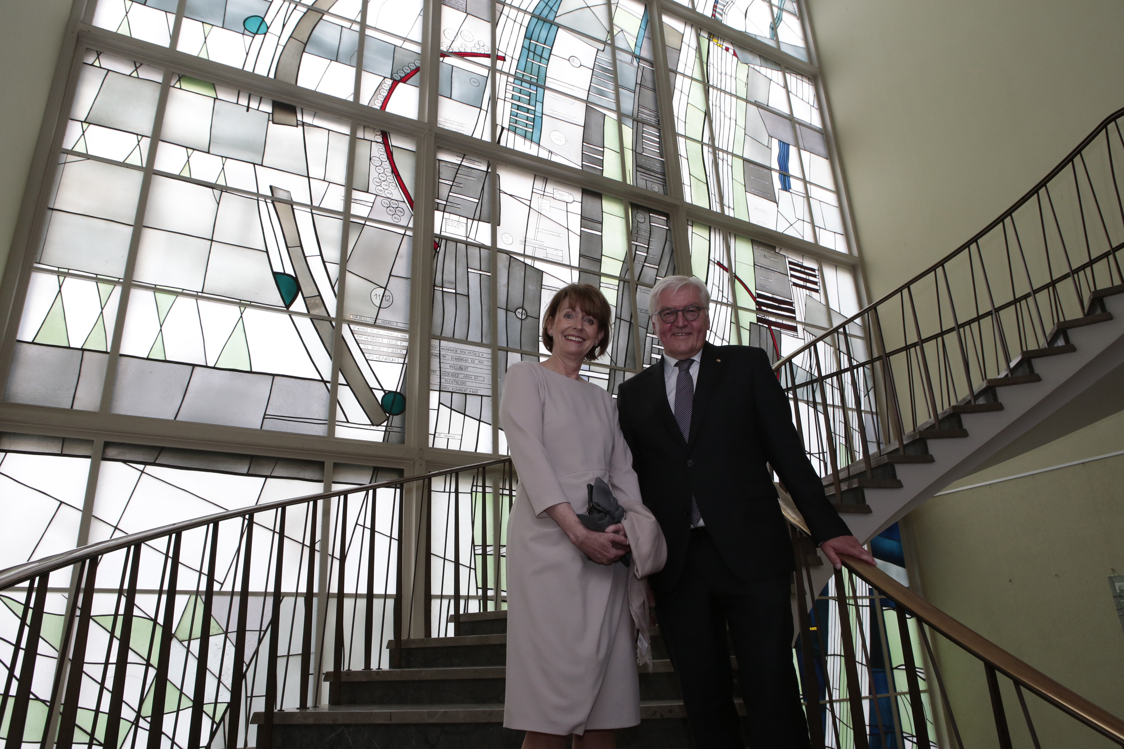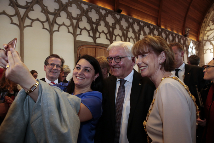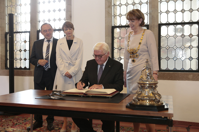 Bundespräsident Dr. Frank-Walter Steinmeier beim Eintrag in das Goldene Buch. Stehend von links: NRW-Finanzminister Dr. Norbert Walter-Borjans, Elke Büdenbender (Ehefrau von Bundespräsident Dr. Frank-Walter Steinmeier) und Oberbürgermeisterin Henriette Reker