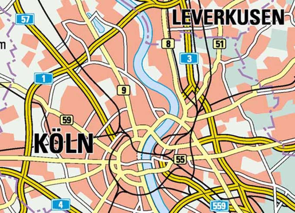 Die Übersichtskarte 1:300.000 zeigt das Gebiet von Aachen (im Westen) bis Gummersbach (im Osten) und reicht von Düsseldorf (im Norden) bis Bad Neuenahr-Ahrweiler (im Süden). Sie veranschaulicht die Siedlungsstruktur und die wichtigsten Verkehrswege zwischen den Städten.